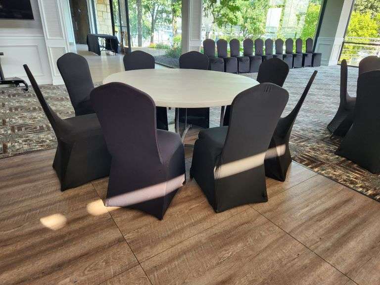 Complete banquet setup ready for your next event. Includes one large 60" round folding banquet table and 8 sturdy banquet chairs. Chairs come with sleek black fitted covers for a clean, professional look.
