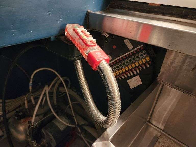 Complete soda dispensing setup including handheld soda gun, carbonator pump, and multi-line flavor valve manifold.