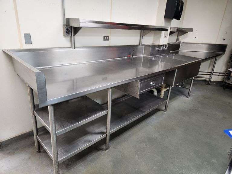 This is a serious commercial-grade prep and wash station designed for high-volume restaurant, catering, or commissary kitchens. Extremely durable, with plenty of prep surface, sink capacity, and storage in one streamlined piece.