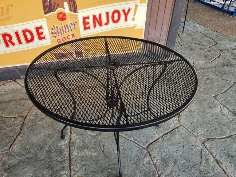 Durable black wrought iron-style patio table with decorative lattice top and center umbrella hole. Perfect for outdoor restaurants, cafes, or backyard seating areas.